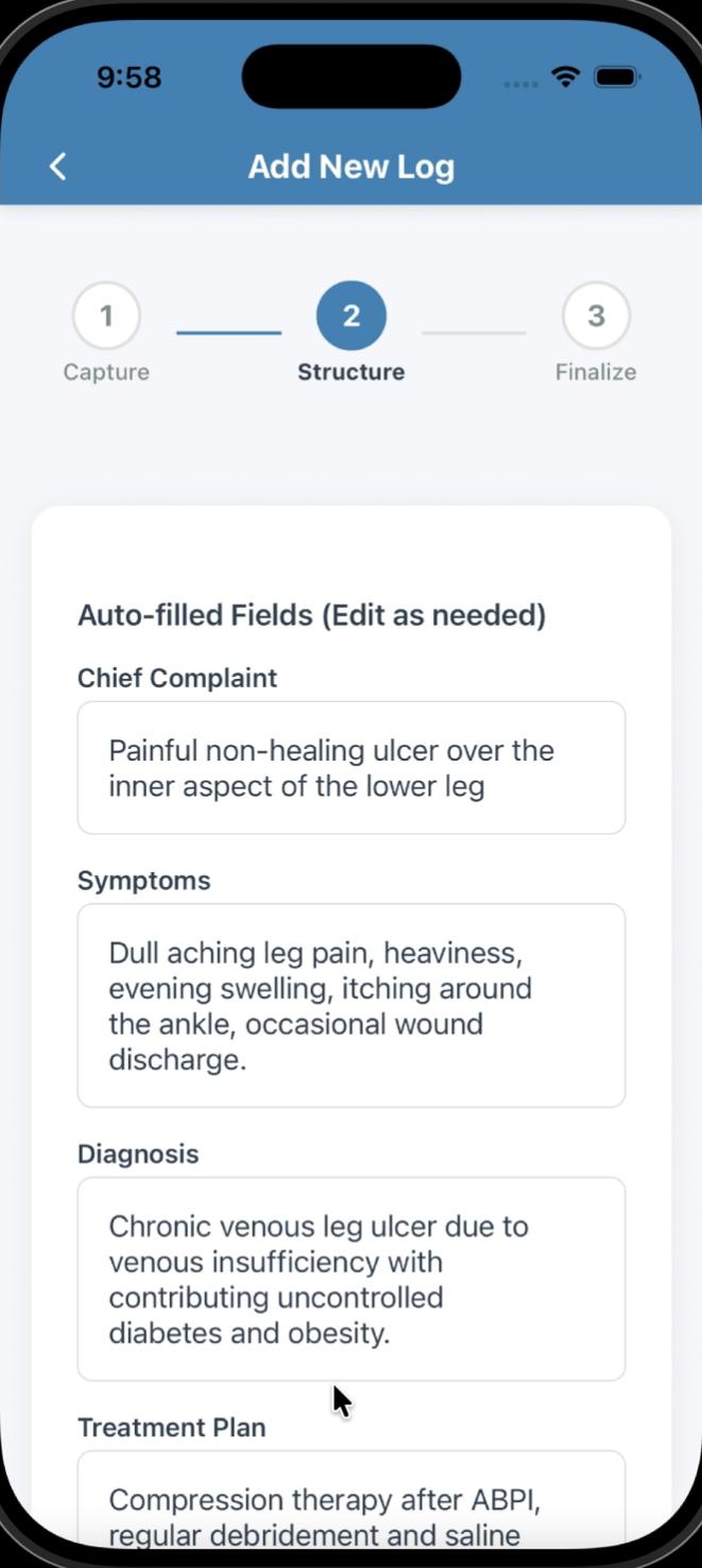 DocuLog uses advanced AI and medical terminology recognition to automatically transcribe your audio recordings into structured clinical notes. Simply record during patient visits, and our system converts the audio into editable medical documentation in your custom formate template.