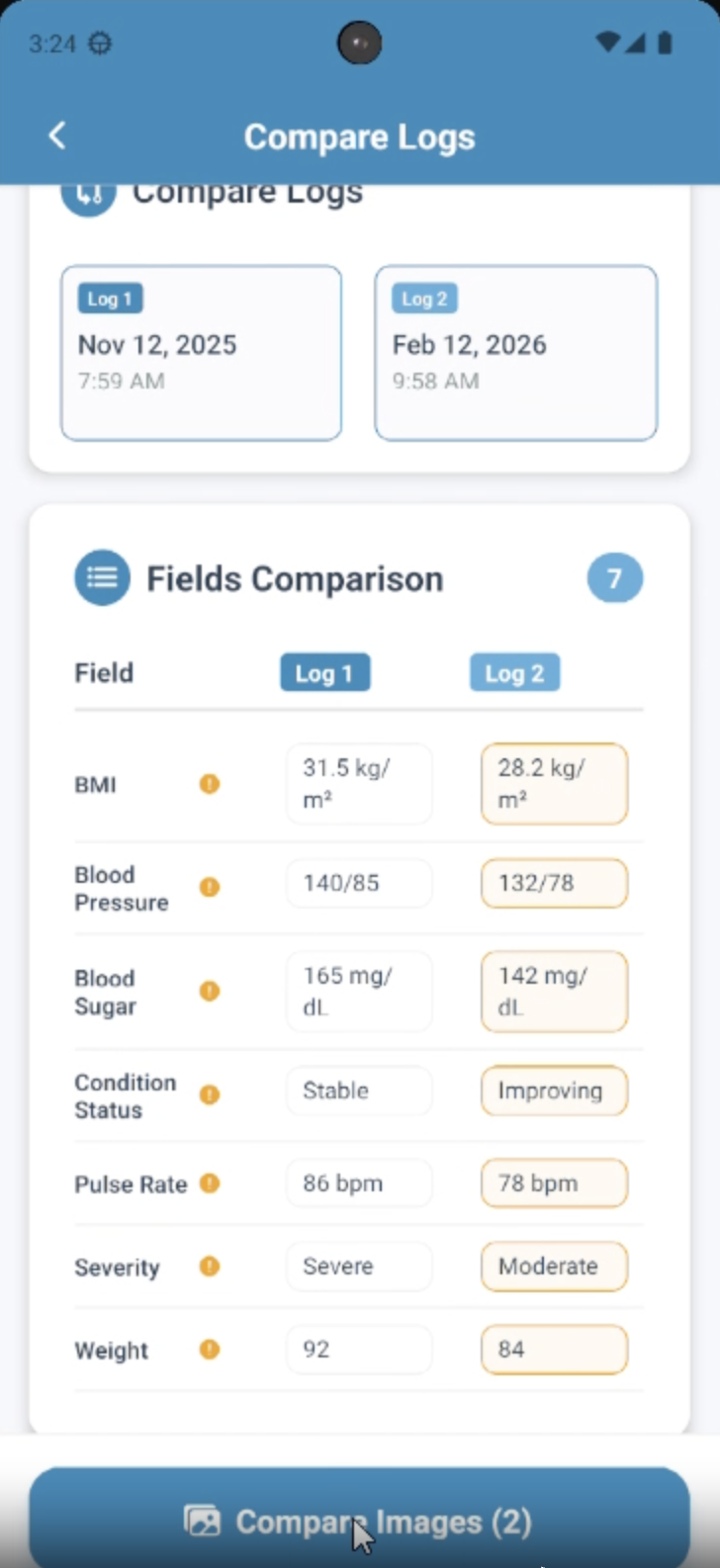 Compare logs between two visits to understand the patient's progress and trends.